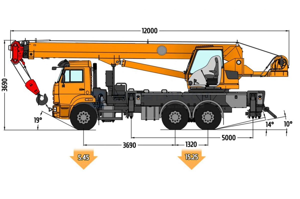 Кран стреловой автомобильный КС-55713-1К-2 грузоподъемностью 25 тонн предназначен для погрузочно — разгрузочных и строительно-монтажных работ на рассредоточенных объектах. Крановая установка смонтирована на трехосном специальном подкрановом шасси модели КамАЗ-65115. Шасси обладают отличной маневренностью и легкостью управления, что позволяет использовать кран на объектах с различными типами подъездных путей, а малые габариты делают его пригодным для эксплуатации в стесненных условиях современных городов.